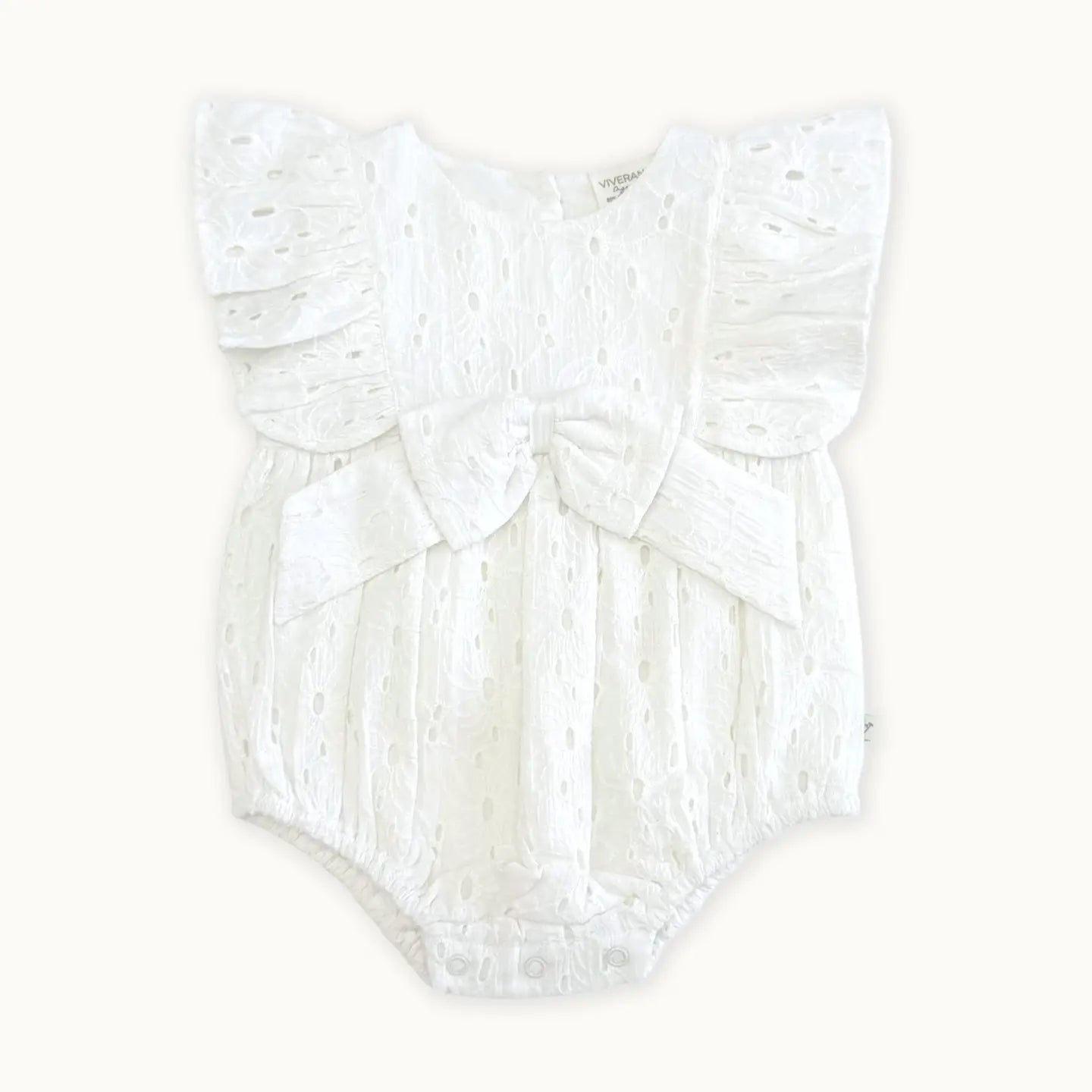 Our darling Luna Schiffli Floral Eyelet Ruffle Sleeve Big Bow Baby Girl Romper, meticulously crafted from soft organic cotton for the perfect blend of comfort and charm. This enchanting romper embodies timeless elegance with its delicate Schiffli eyelet in off-white hue adorned with a statement big bow in the back. Adorable ruffle sleeves add a touch of whimsy and grace to your little one's ensemble. Designed for ease of dressing, the romper boasts a convenient button opening in the back and snap opening at the crotch provides added convenience for diaper changes without compromising style. Whether it's a special occasion or a casual day out, our Luna Schiffli Floral Eyelet Ruffle Sleeve Baby Girl Romper will surely steal hearts and turn heads. Embrace the sustainability of this timeless design, destined to become a cherished favorite in your baby girl's wardrobe.