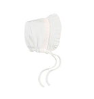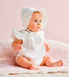 Cotton interlock bonnet features smocked embroidery, ruffle trim and chin ties.