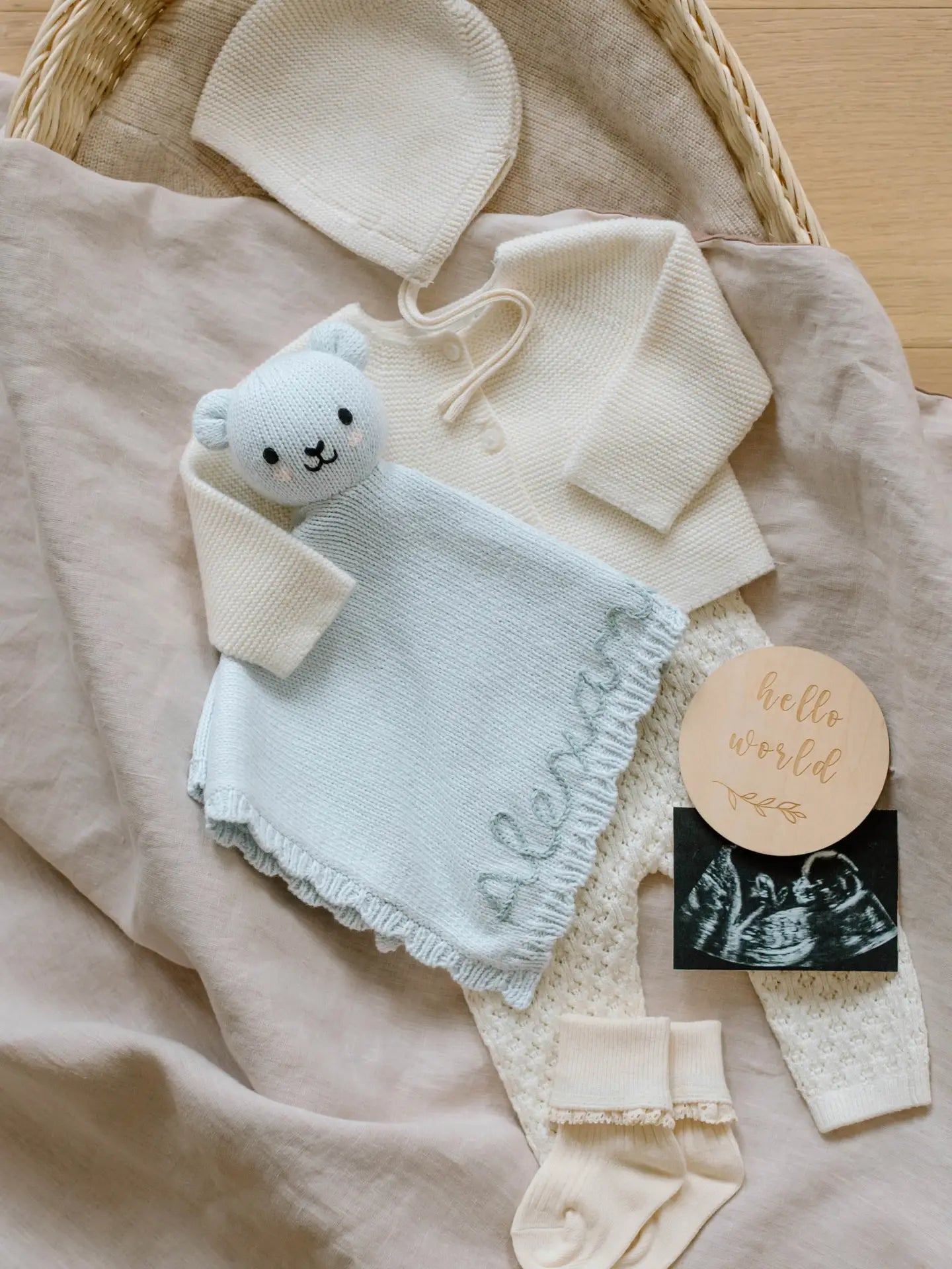 About the lovey collection Beautifully hand-knit and luxuriously soft, our heirloom-quality loveys are designed to comfort your little one from day one. Each one is handcrafted from 100% organic cotton and finished with delicate scalloped trim and sweet hand-embroidered details that coordinate perfectly with our beloved baby animal collection. Every lovey provides 5 meals to children in need and empowers fair trade artisans with sustainable income. Fabric & Features: * Hand-knit with 100% organic cotton yarn * Designed with a beautifully scalloped trim * Stuffed with hypoallergenic polyfill to be the ideal cuddle weight * Each lovey coordinates with our beloved baby animal collection * Safe + non-toxic: US + CE + Canadian safety standard certified * Every lovey comes with a special booklet sharing our mission to feed children in need * Every lovey has a special ‘gives 5 meals’ tag * Loveys are approximately 14" x 14” in height * Handmade in Peru using sustainable, fair trade practices