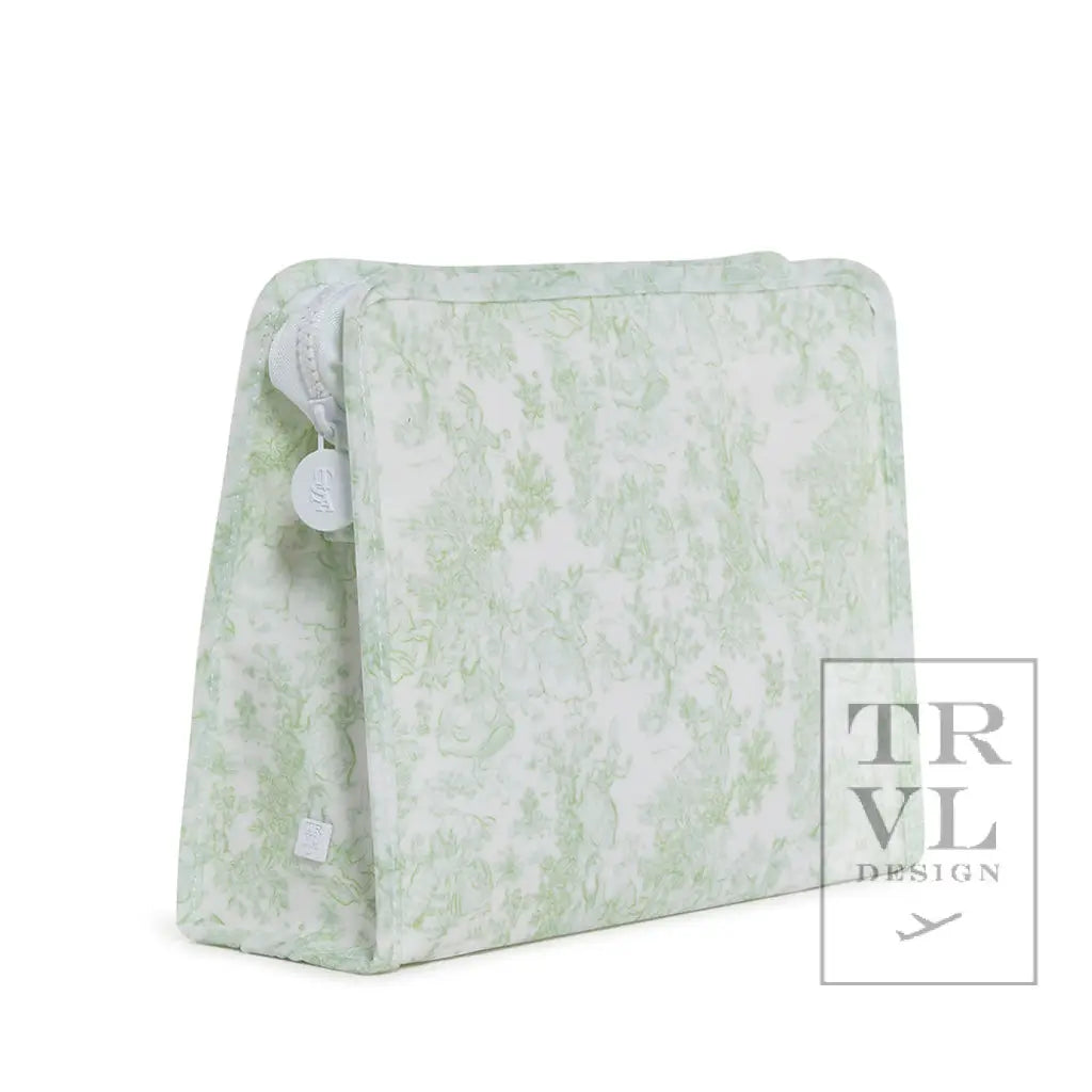 Our best-selling Roadies are our BFFs in the pouch world! This print is available in 2 sizes, our Large Roadie is made with a thin Eco-friendly matte coating, an inside slip pocket and exterior snap open zip tabs for a wider opening and an easier access. * Size: 10.5"l x 8.75"h x 3.5"d * Coated Cotton * Lined in poly twill * Chunky White Zipper with snap closure * Water and stain resistant & wipeable inside and out * Care: wipe with a clean damp cloth