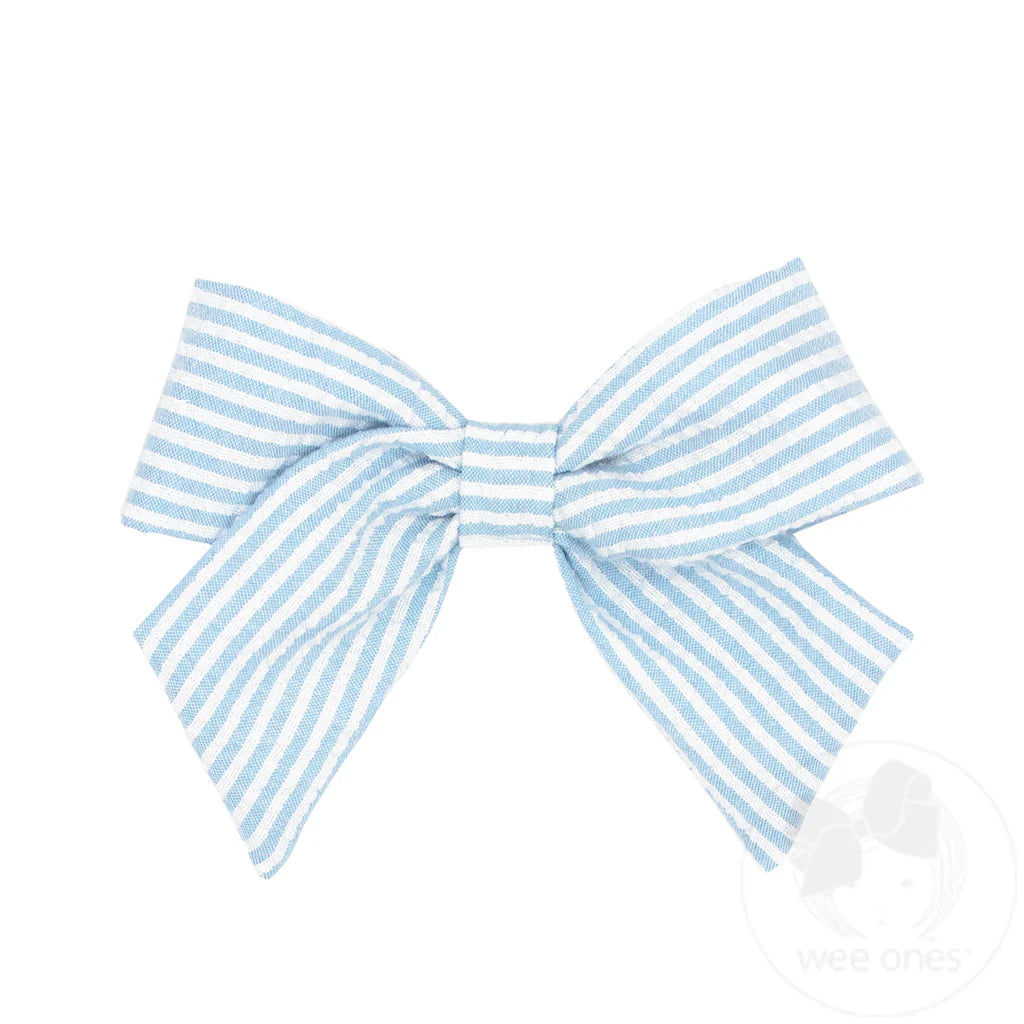 This Medium Genuine Seersucker Fabric Bowtie with Tails brings timeless summer style to your little one’s look, adding a light and breezy touch perfect for warm days. Soft and classic, it’s the must-have accessory for sunny adventures. This bow is sure to stay in her hair all day with our patented WeeStay™ no-slip hair clip.