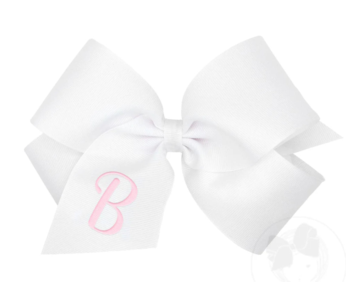 Make your favorite little girl feel special with our monogrammed king grosgrain bow. This white hair bow for girls is embellished with a light pink initial and is available in 23 different letters. This bow is sure to stay in her hair all day with our patented WeeStay™ no-slip hair clip.