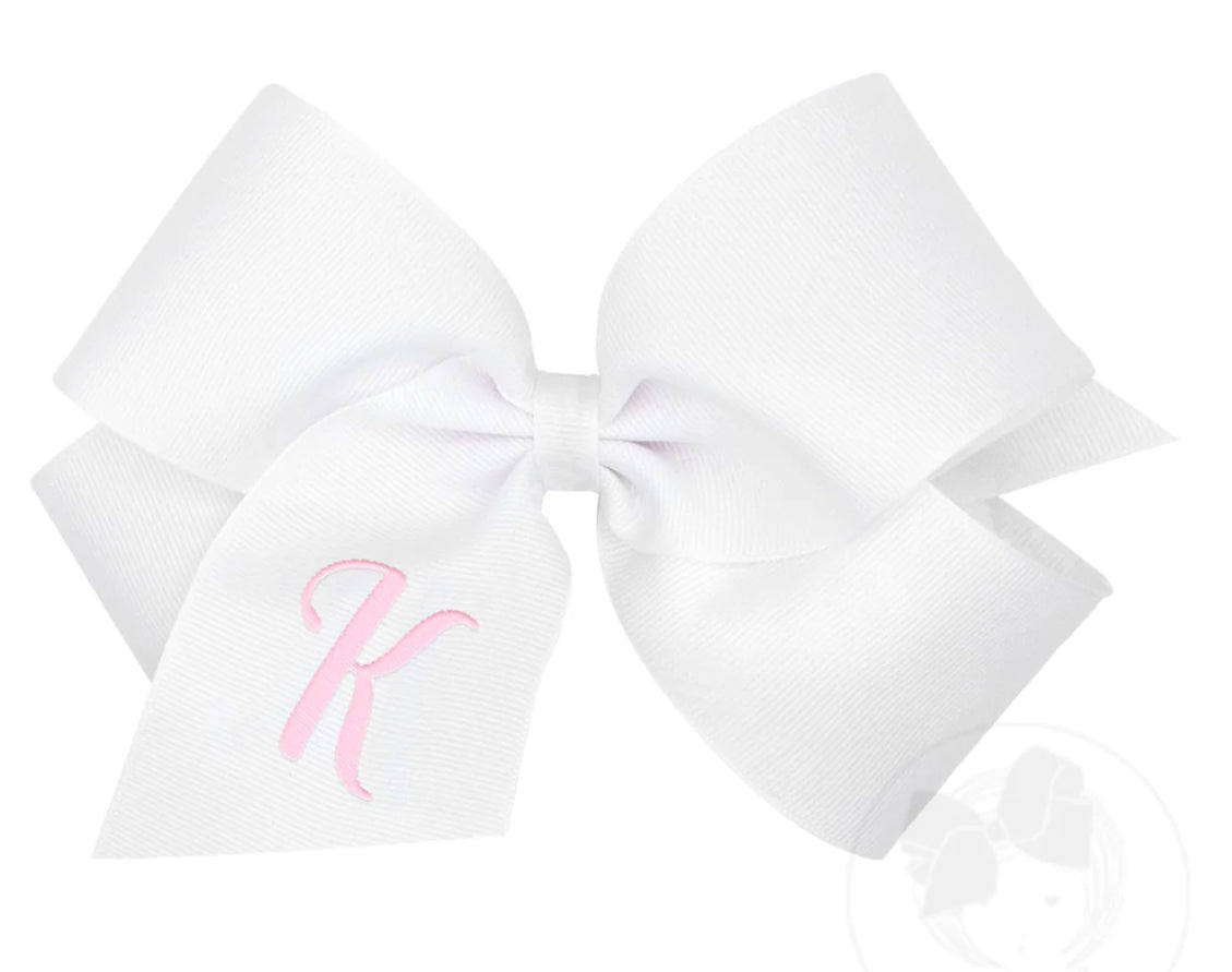 King Monogrammed Grosgrain Girls Hair Bow - White with Light Pink Initial- K
