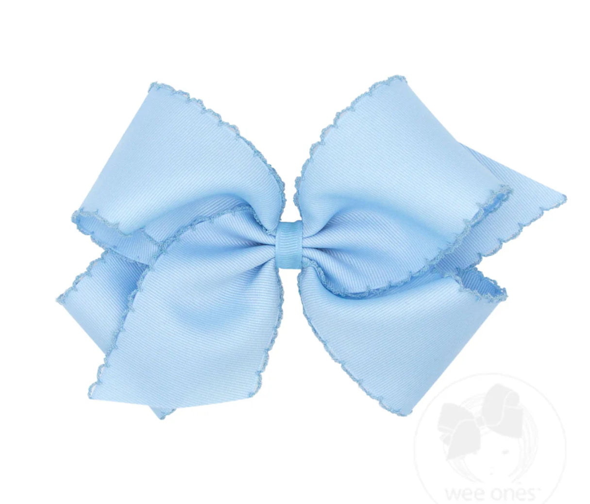 It doesn't get better than our classic king bow with a matching moonstitch edge. This bow is sure to stay in her hair all day with our patented WeeStay™ no-slip hair clip. Available in several beautiful colors, she'll love more than one!