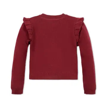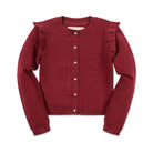 Our adorable ruffle detail sweater cardigan is a sophisticated wardrobe staple for your little lady! The soft and smooth milano stitch gives this classic style the body and structure of a double knit, while elegant gold buttons at the front add just the right amount of sparkle. * 100% Organic Cotton, exclusive of trims. Garment is 100% GOTS-Certified Organic. Learn more about our certifications here. * Pleated ruffle detail at shoulder seams. Gold button details at front closure. * Machine washable.