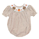 A festive gingham smocked bubble with embroidered turkeys, puff sleeves, and snaps for easy changes. Perfect for Thanksgiving gatherings and fall photos.