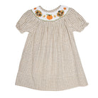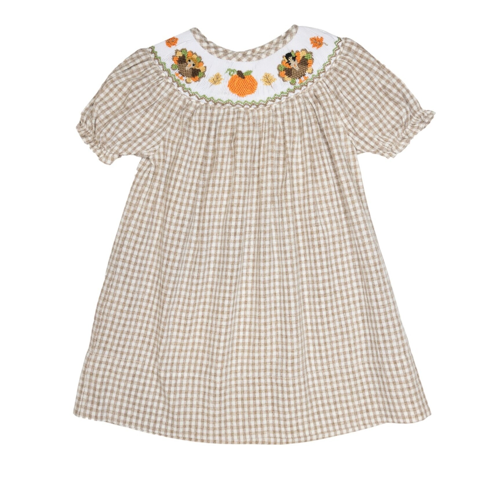 A festive gingham smocked dress with hand-embroidered turkeys, puff sleeves, and a classic silhouette. Perfect for Thanksgiving portraits and family gatherings.