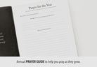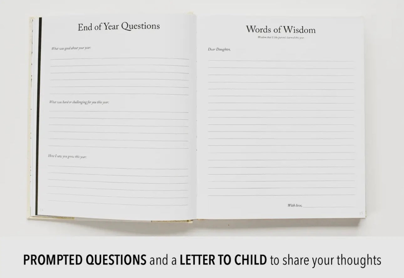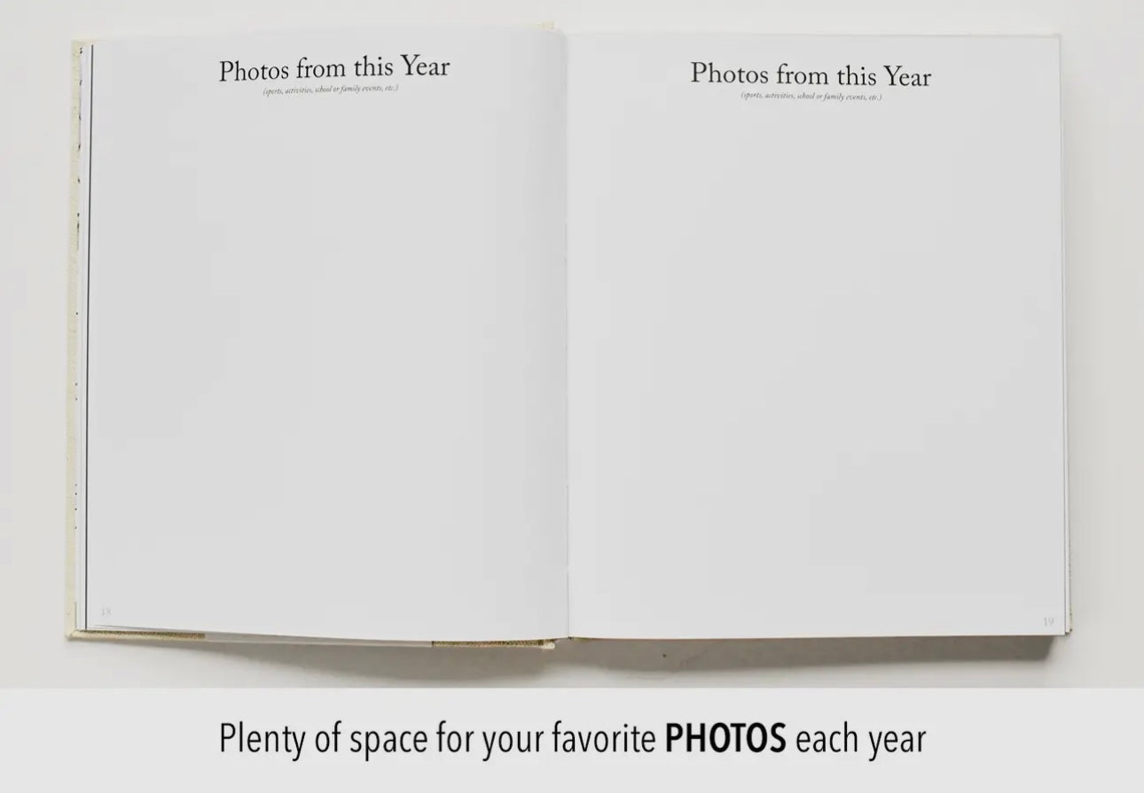 This book begins with a section for birth and delivery (birth story, photos, birth stats, handprints + footprints). Following your child's birth story, each year will include these pages: Vision for the year: word, bible verse, and prayer for your child's year. Birthday celebration. "All About You" (kid survey + milestones). End of Year prompted questions. Words of Wisdom (letter from mom or dad). Forget-Me-Nots (favorite quotes and memories). Photos from this year.