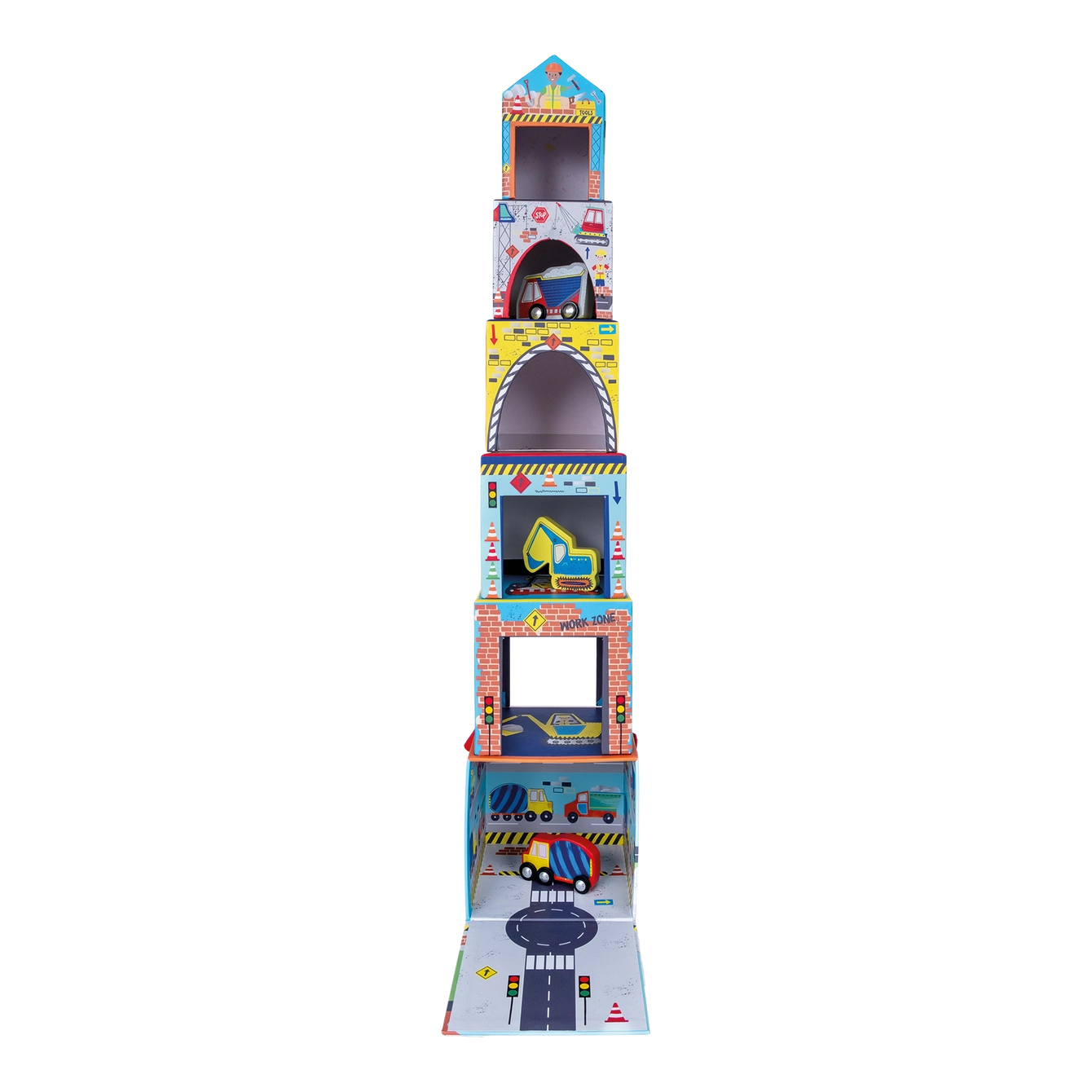 Get ready for endless amounts of fun with Stack & Play. Make a tower, then hide and play using the wooden pieces. Count the numbers on one side, then match up the scenes on the other (either by stacking or laying them side by side). The cool Construction design features diggers, trucks, cement mixers and more. Stack & Play includes 6 stacking cubes, 3 wooden play pieces, 2 on wheels. All parts are stored in the biggest box with a handy carry handle, making it so easy to take around with you! FEATURES: 3 wooden pieces to play with (2 on wheels!) Neatly packs away inside the biggest box Carry handle Fun tunnel features Learn to count/match up the pictures Eco friendly Recommended age: 2+