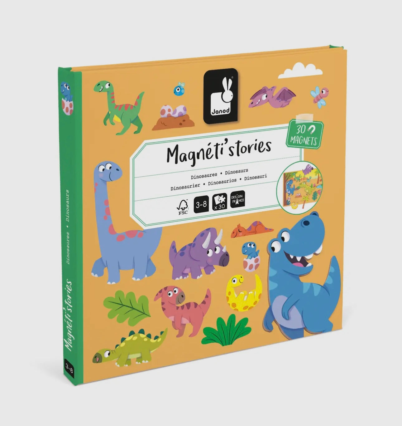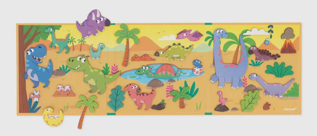 Open this book and delve into the world of dinosaurs! With this ultra-portable, adorable magnetic book, your child’s imagination will roam free as they invent their own dinosaur-related stories. Open it up to find a large magnetic backdrop and 30 magnets depicting all kinds of dinosaurs and decorative elements, which are perfect for enhancing any story! Magnetic toy made for children ages 3 and up.