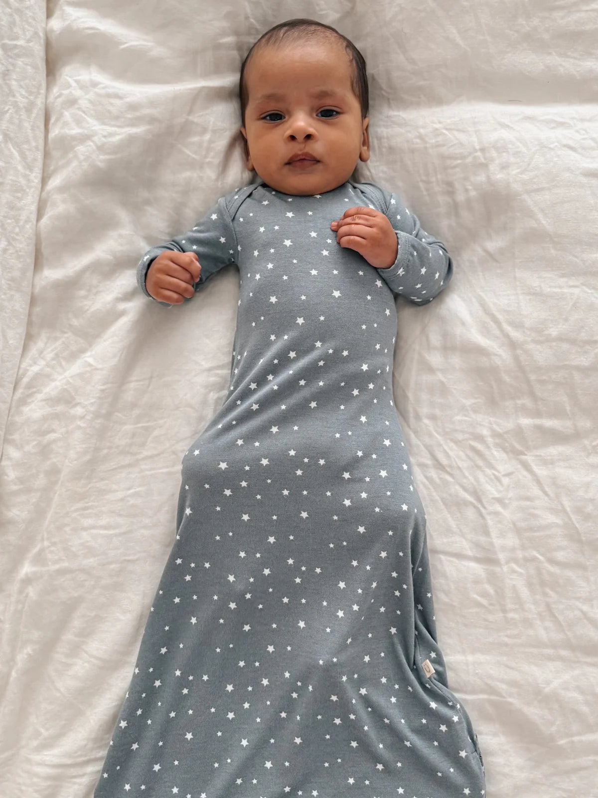 No knotting needed. – we're all about easy. Keep your tiniest tucked in with our extra-long take on the traditional baby gown with easy-access DIAPER-ZiP. The easiest changes and silky soft bamboo fabric means more coziness for them. One size fits NB to 3M.