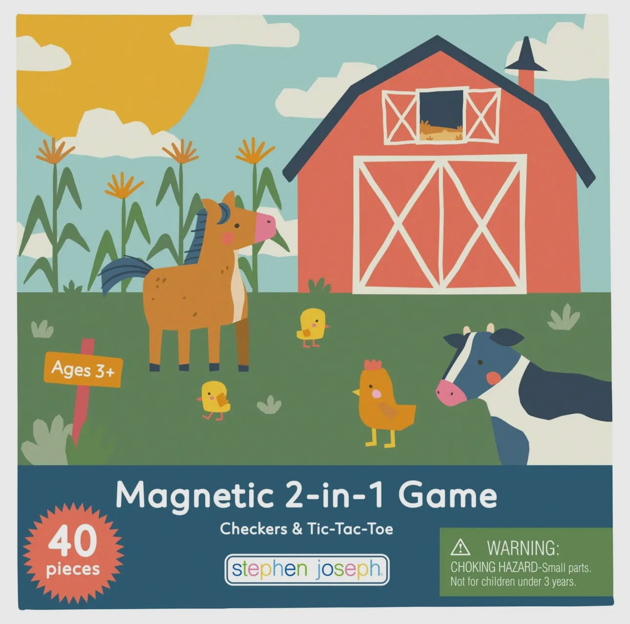 Unleash your child's inner strategist with our Magnetic 2 in 1 Game! Featuring both checkers and tik-tac-toe, this game is perfect for your little one's developing mind. With adorable designs and magnetic pieces, it's both fun and functional. Includes 40 pieces for endless entertainment. Game on! * 40 pieces * Includes checkers and tic-tac-toe * Approx. 7" x 7" (17.8cm x 17.8cm) * Sturdy paper wrapped grayboard * Rubber magnets * Spot clean WARNING: Choking hazard, small parts. For children 3+